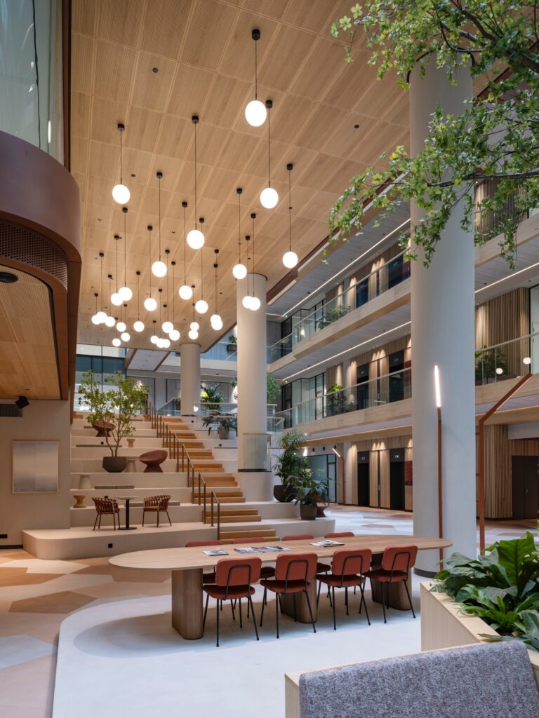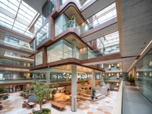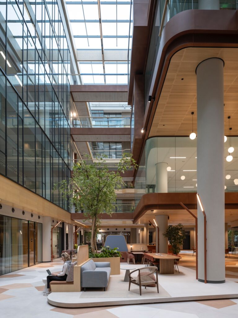 Het enorme kantoor is ontworpen met het oog op de veranderende rol van de werkplek. Want het gaat tegenwoordig niet meer alleen om bureaus en vergaderruimtes, maar om een totaalervaring die samenwerking, welzijn en productiviteit ondersteunt. Het gebouw beschikt over gedeelde vergaderfaciliteiten, ruime lounge- en ontmoetingsplekken, een dakterras met uitzicht over de stad, horeca en een game room.